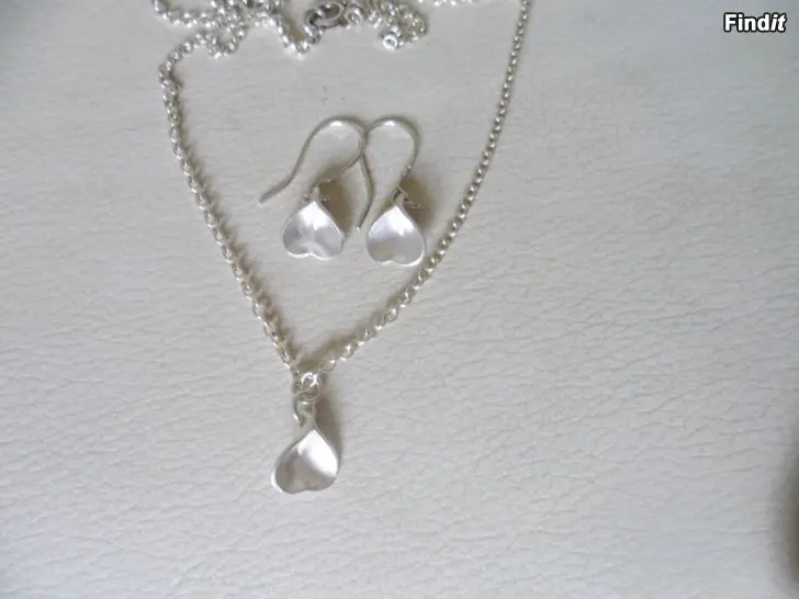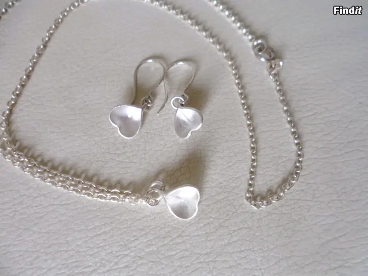 Korvakorut pituus n.28mm, leimat koukuissa KK, 925. Kaulakoru 50,5cm, 42 - 45 - 50,5 cm säädettävä, leimat 925, KK, vene. Uudenveroisessa kunnossa. Hinta yhteensä.
