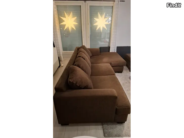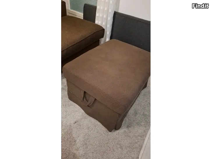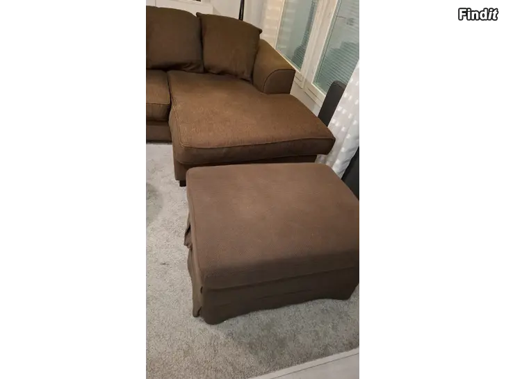 Mörkbrun divansoffa köpt från Mio. Väldigt bra kvalitet, har hållit formen längs med åren, ej nedsutten. Överdragen tvättade i somras. Fotpall från Ikea med förvaring medföljer.