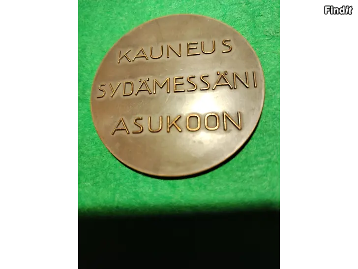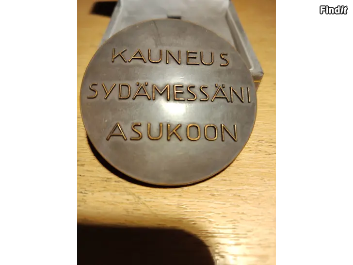 Kääntöpuolella teksti: KAUNEUS SYDÄMESSÄNI ASUKOON. Tämän tekstin Aaltonen löysi Kiven papereita selatessaan. Lause kuvaa täydellisesti molempien ajatusmaailmaa ja estetiikkaa.