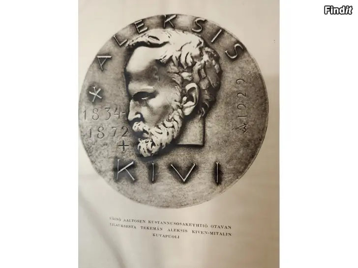 Wäinö Aaltosen v. 1929 muotoilema pronssinen ja kohokuvioinen, erittäin harvinainen Aleksis Kiven, 1834-1872, muistomitali, jota Kustannusosakeyhtiö Otava tilasi hopeisena 75 kpl ja pronssisena 500 kpl:tta.