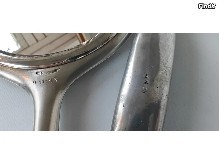 Harrastajalle vaikka lahjaksi vintagea... v. 1948 tehty hieno hopeinen käsipeili, leimat ja kauniit monogrammit.