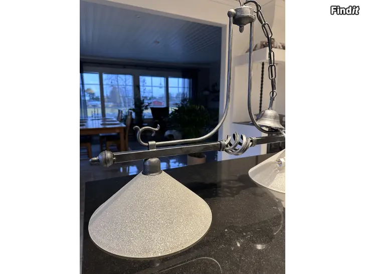 En fin taklampa från Isku säljes som obehövlig efter renovering. Bredden är ca 85cm mellan skärm-ytterkanterna. Lampan är grå och har vita, frostade glasskärmar. I fint skick.