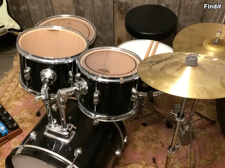 Trumset med bastrumma 18”, tomtoms 10”, 12”, 14” Pearl och virvel 13” Tama. Allt i skick och väl fungerande. Komplett med stativ, pedaler, stol och cymbaler. Priset kan diskuteras.