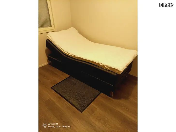 Motor säng köpt från Asko för ca. 1år sen 200x90cm, finns några hål vid fontänden på sidan för vi skruvade upp två faner så att vår pappa inte skulle ramla ur sängen.