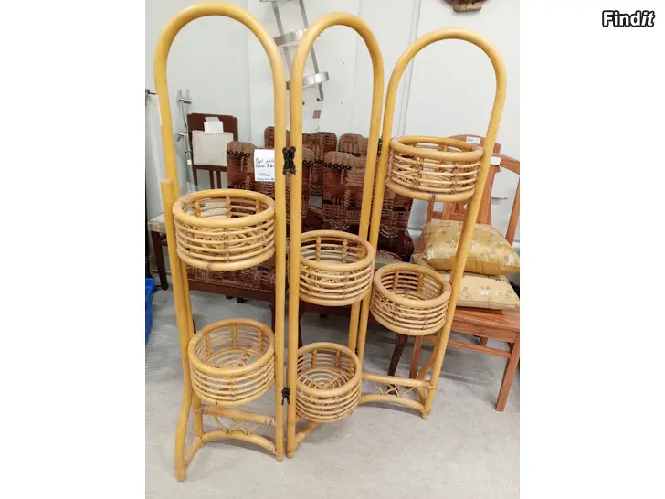 Siisti rottinkinen kukkateline, osiot käänneltävissä. Korkeus 130cm, kokonaisleveys 90cm, ruukkutelineen sisähalkaisija 20.5cm.